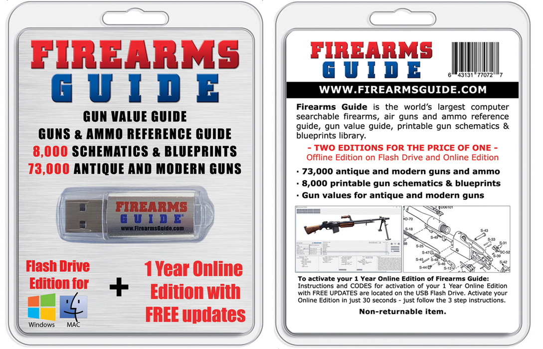 The Firearms Guide Flash Drive & Online Combo is modern, digital, searchable gun publication that combines a reference guide on antique and modern guns with printable gun schematics and blueprints library and with gun value guide. All that content is conveniently placed online, but also on a fast 16GB flash drive as offline backup for Windows PC or Mac.